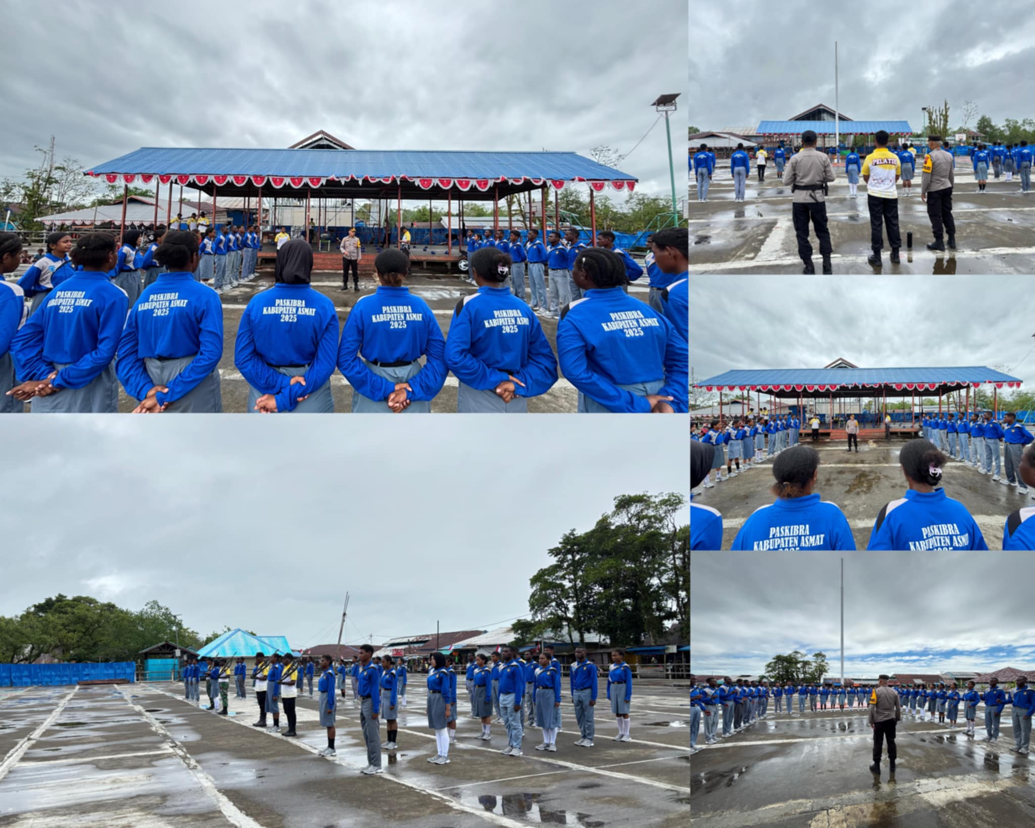 Asmat – Wakapolres Asmat Kompol Haryono, S.H., Pantau latihan 40 anggota Pasukan Pengibar Bendera (Paskibra) Kabupaten Asmat, Bertempat di Lapangan Yos Sudarso, Senin (04/08/2025).