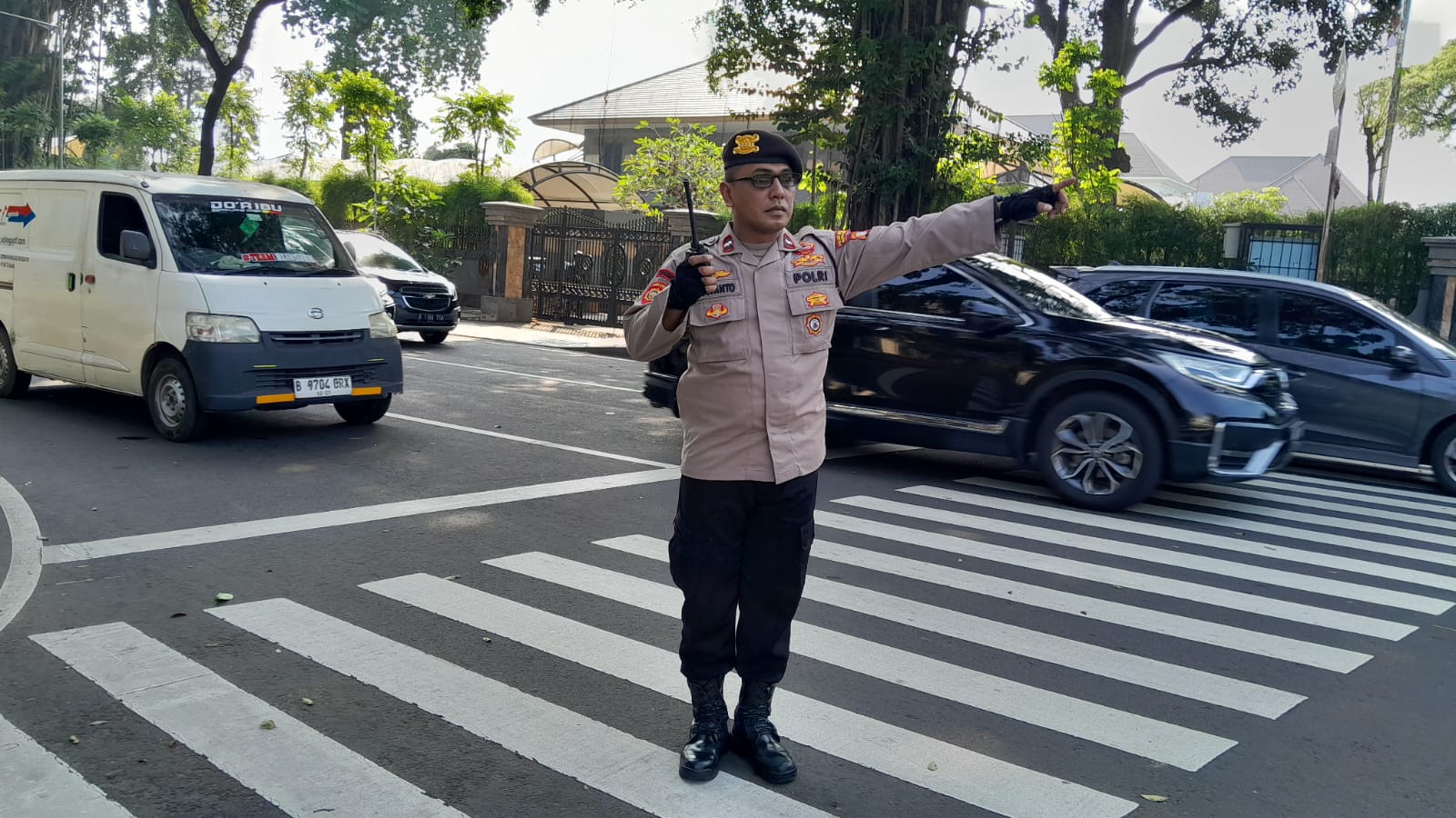 Jakarta Pusat – Anggota Patmor Sabhara Polsek Metro Menteng melaksanakan pengaturan arus lalu lintas siang hari di jalan Imam Bonjol Menteng Jakarta Pusat. Senin (22/7/2024).