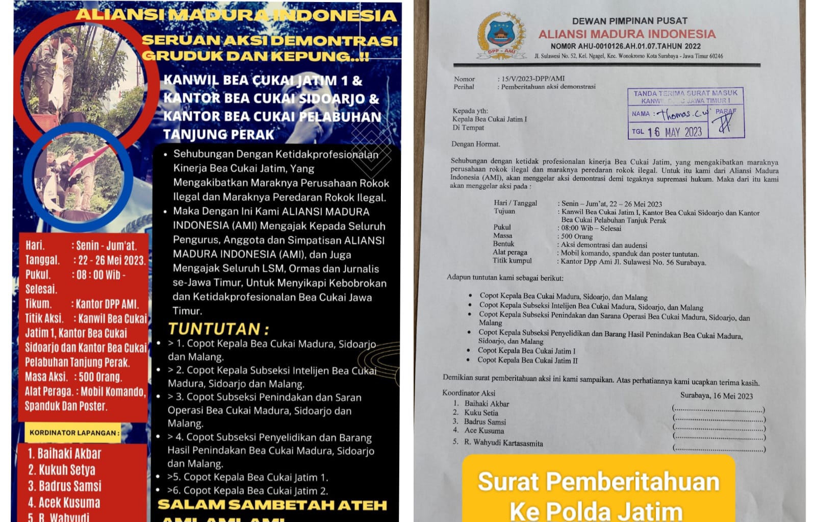 Setelah mendapatkan undangan dari Satgassus Tipikor Mabes Polri Sebagai Narasumber tentang Cukai, Aliansi Madura Indonesia (AMI) langsung mengambil sikap tegas untuk turun aksi demo besar-besaran di Kantor Wilayah Bea Cukai Jatim 1, Kantor Bea Cukai Sidoarjo dan Kantor Bea Cukai pelabuhan Tanjung Perak.