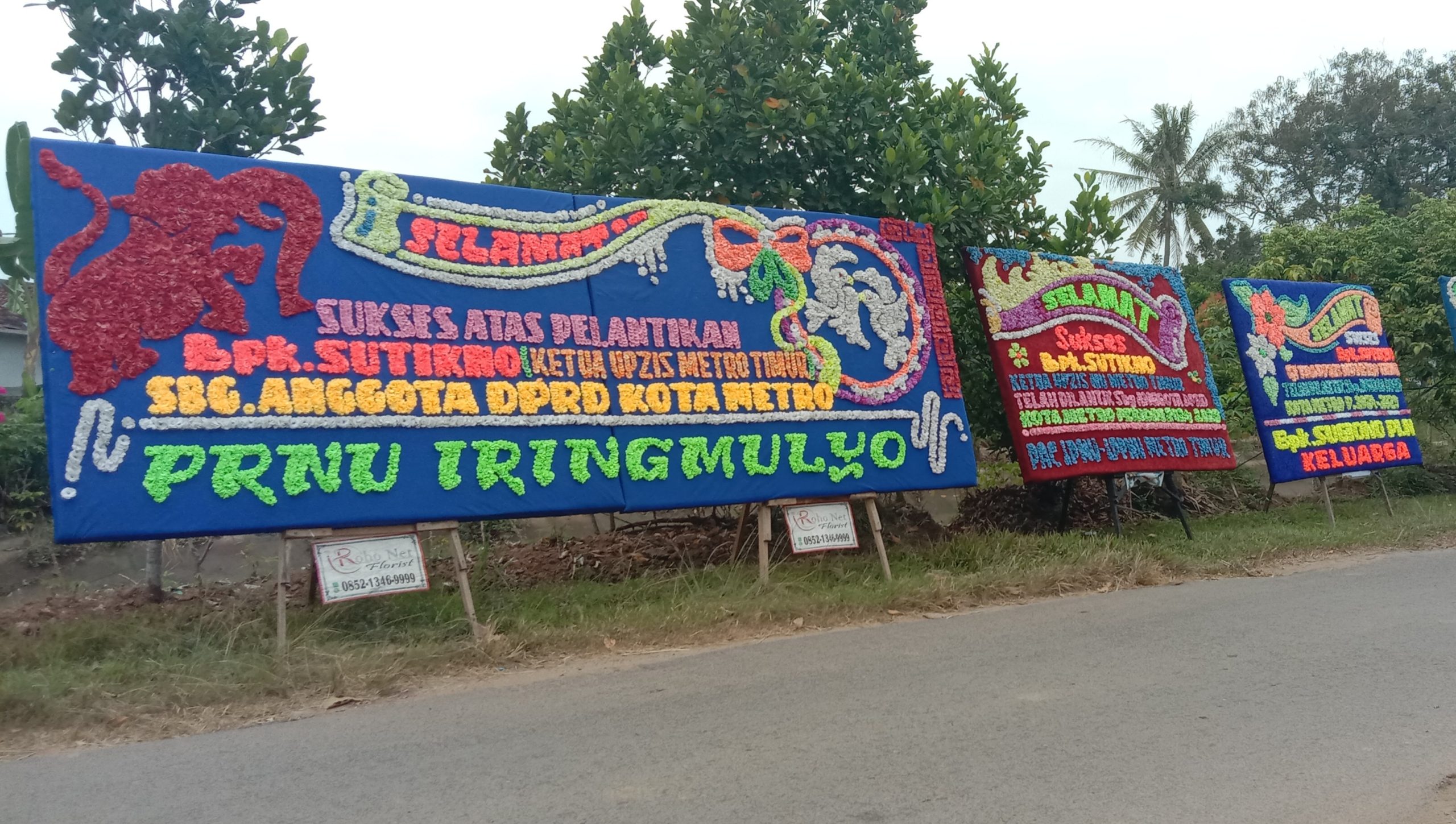 Dari pantauan media ini puluhan karangan bunga terpampang diarea kediaman anggota DPRD Fraksi PKB dapil III Metro Timur sepanjang jalan irigasi tejosari metro timur hingga ke tugu bola dengan berbagai ucapan dan doa