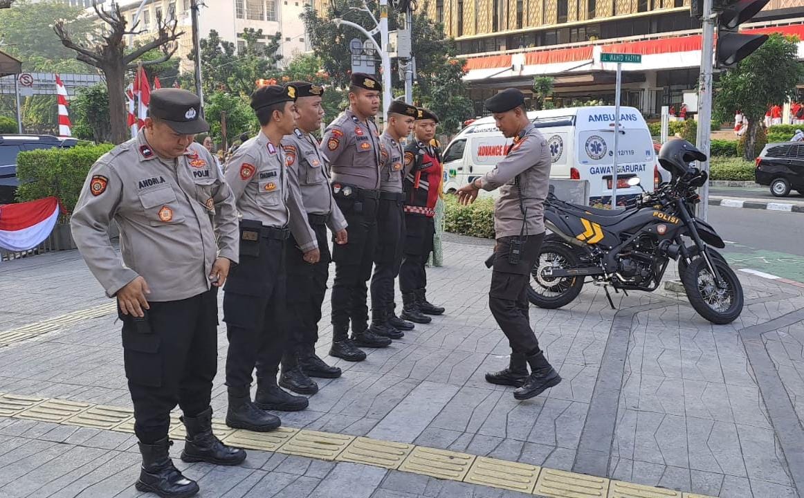 Jakarta Pusat – AKP Samsul Bahri selaku Kanit Samapta Polsek Metro Menteng Pimpin apel pengamanan dan antisipasi giat perlintasan kirab bendera merah putih Jakarta Pusat. Minggu (11/8/2024).
