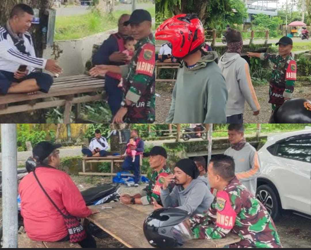 MIMIKA- Babinsa Koramil 02/Timika Kodim 1710/Mimika, Serma Wawan Setiawan dan Serda Samsudin melaksanakan Komunikasi Sosial (Komsos) bersama tukang ojek yang sedangdi Kelurahan Kwamki Baru, Distrik Mimika Baru, Jumat, (25/4/2025).