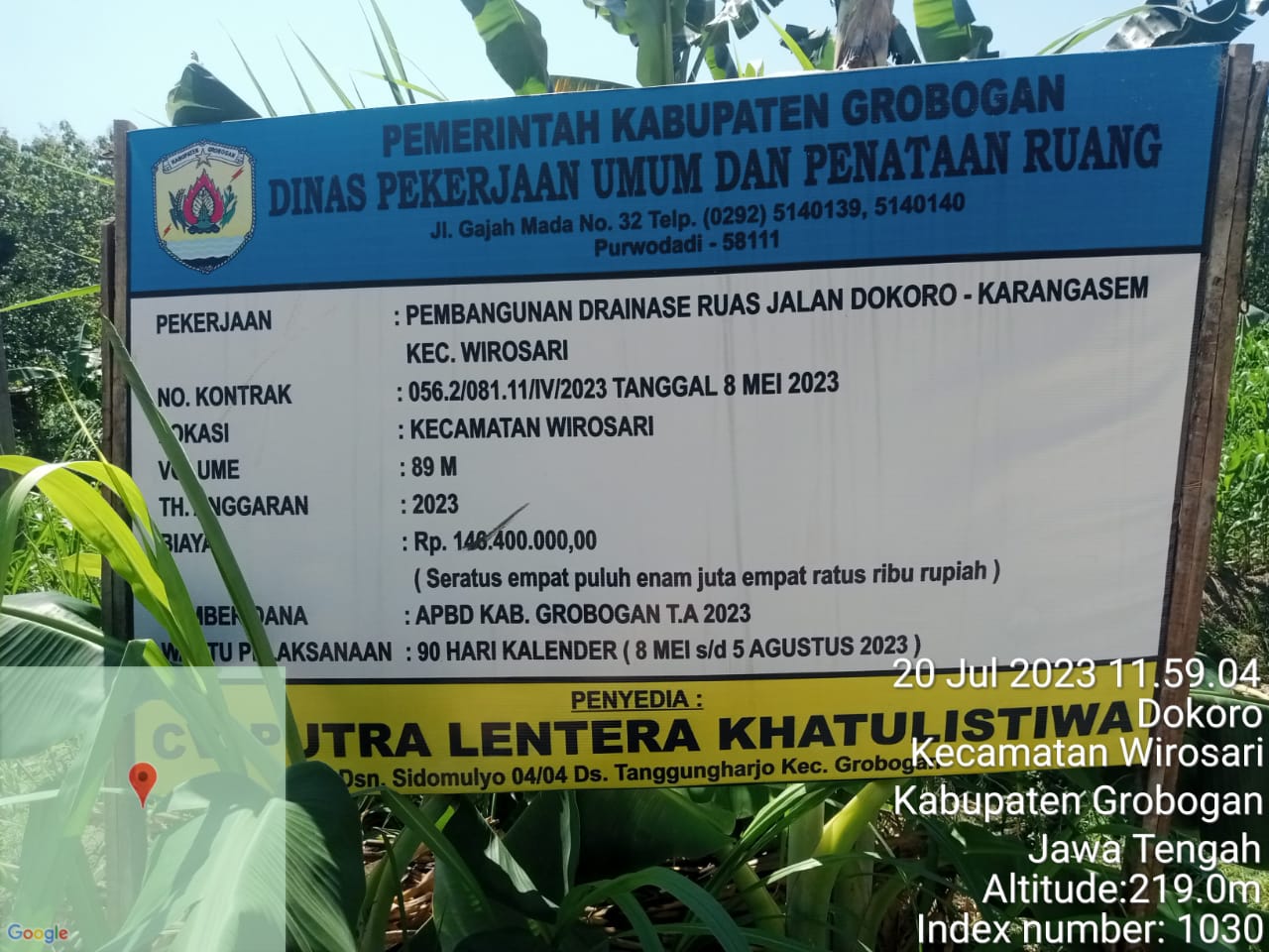 Kegiatan pekerjaan yang dibiayai dari APBD Kabupaten Grobogan TA 2023, dengan nilai pagu Rp.147.300.000,00 yang lingkup pekerjaan utama adalah saluran drainase dengan konstruksi pasangan batu belah putih, dengan panjang drainase 89M. Dan Dinas PUPR Grobogan sebagai pelaksana kegiatan, terkesan pengawasannya dalam hal ini tidak maksimal.