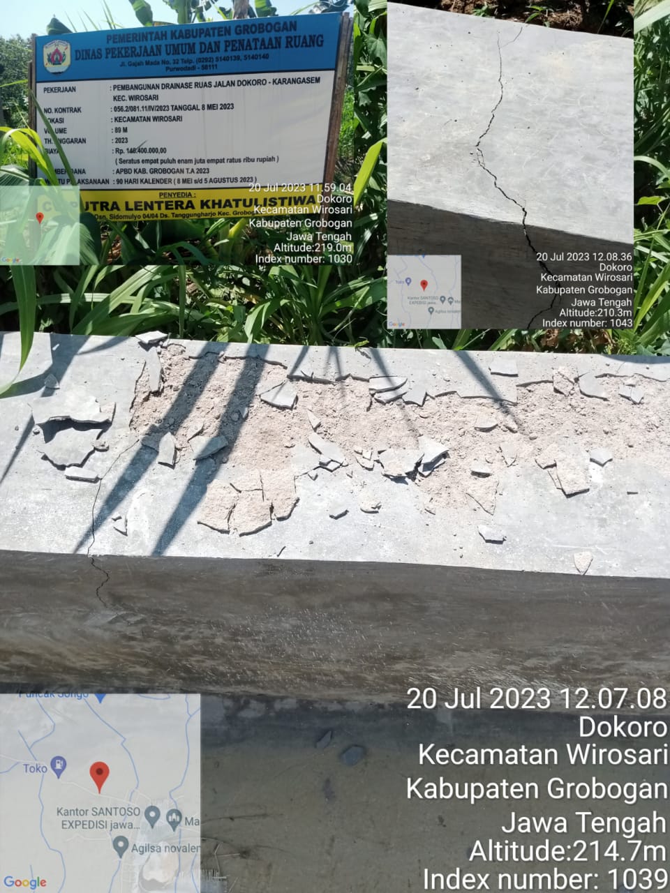 Grobogan,Suaraindonesia.online – Pekerjaan drainase ruas jalan Dokoro – Karangasem, Kecamatan Wirosari, Kabupaten Grobogan yang baru beberapa bulan selesai pekerjaannya sudah banyak mengalami kerusakan.