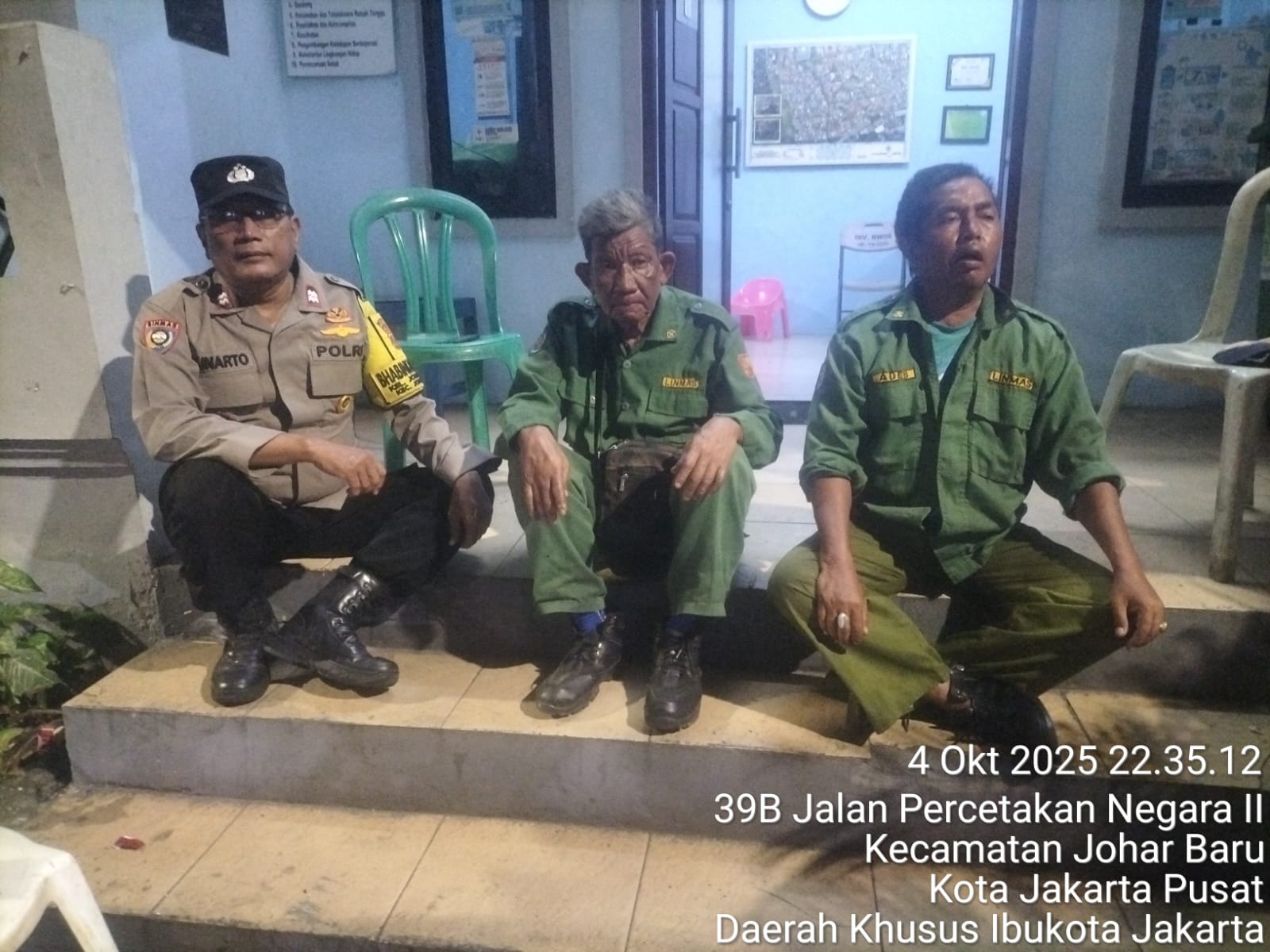 Jakarta Pusat – Untuk menjaga situasi keamanan dan ketertiban masyarakat pada malam hari, Bhabinkamtibmas Kelurahan Johar Baru, Aiptu Sunarto, melaksanakan patroli dialogis dan sambang poskamling di wilayah RW 06 Kelurahan Johar Baru, pada Minggu dini hari (5/10/2025), pukul 00.25 WIB.