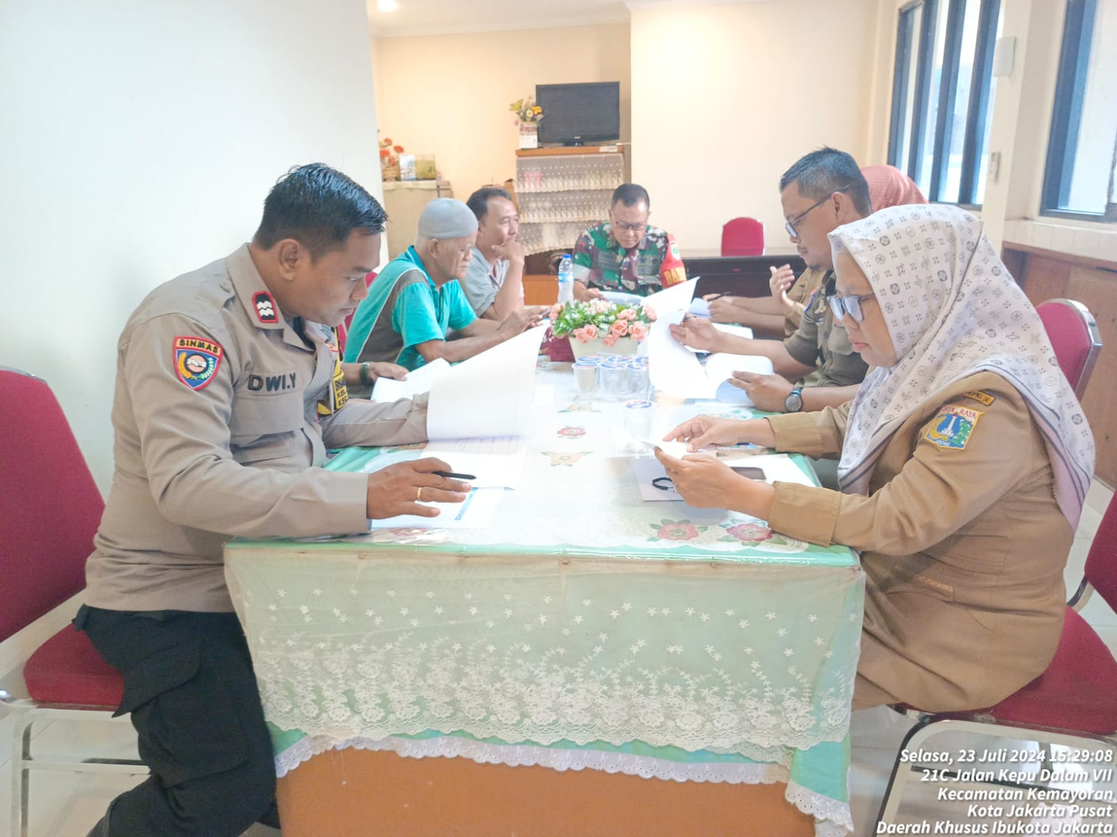 Jakarta Pusat – Bhabinkamtibmas Kelurahan Kemayoran Aiptu Dwi Bersama 3 Pilar Melakukan Rapat Koordinasi dan Apresiasi Dalam Rangka Gerakan Tertib Adminduk di Aula Kantor Kelurahan Kemayoran Kecamatan Kemayoran Jakarta Pusat. Selasa (23/7/2024).