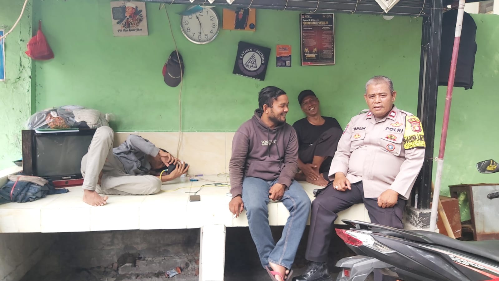 “Agar bersama sama menjaga keamanan dan ketertiban lingkungan, saling tukar informasi terkait kerawanan wilayah terutama tawuran, perhatikan kembali parkir kendaraan jangan sampai mengganggu jalan umum dan waspadai aksi curanmor.” Pesan Aiptu Yansen