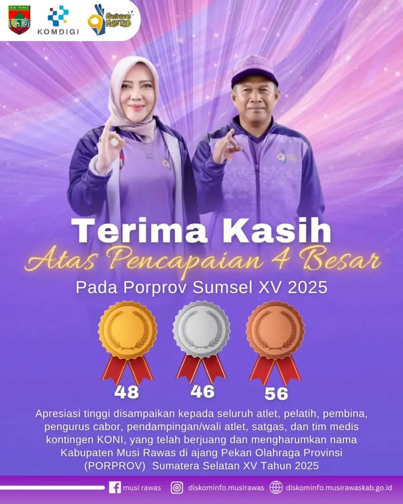 ”Selamat dan terima kasih yang tak terhingga kami sampaikan kepada seluruh atlet, pelatih, dan ofisial kontingen Musi Rawas. Pencapaian 4 Besar di PORPROV Sumatera Selatan XV Tahun 2025 adalah sebuah prestasi yang patut dibanggakan,” ujar Bupati Musi Rawas Hj. Ratna Machmud.