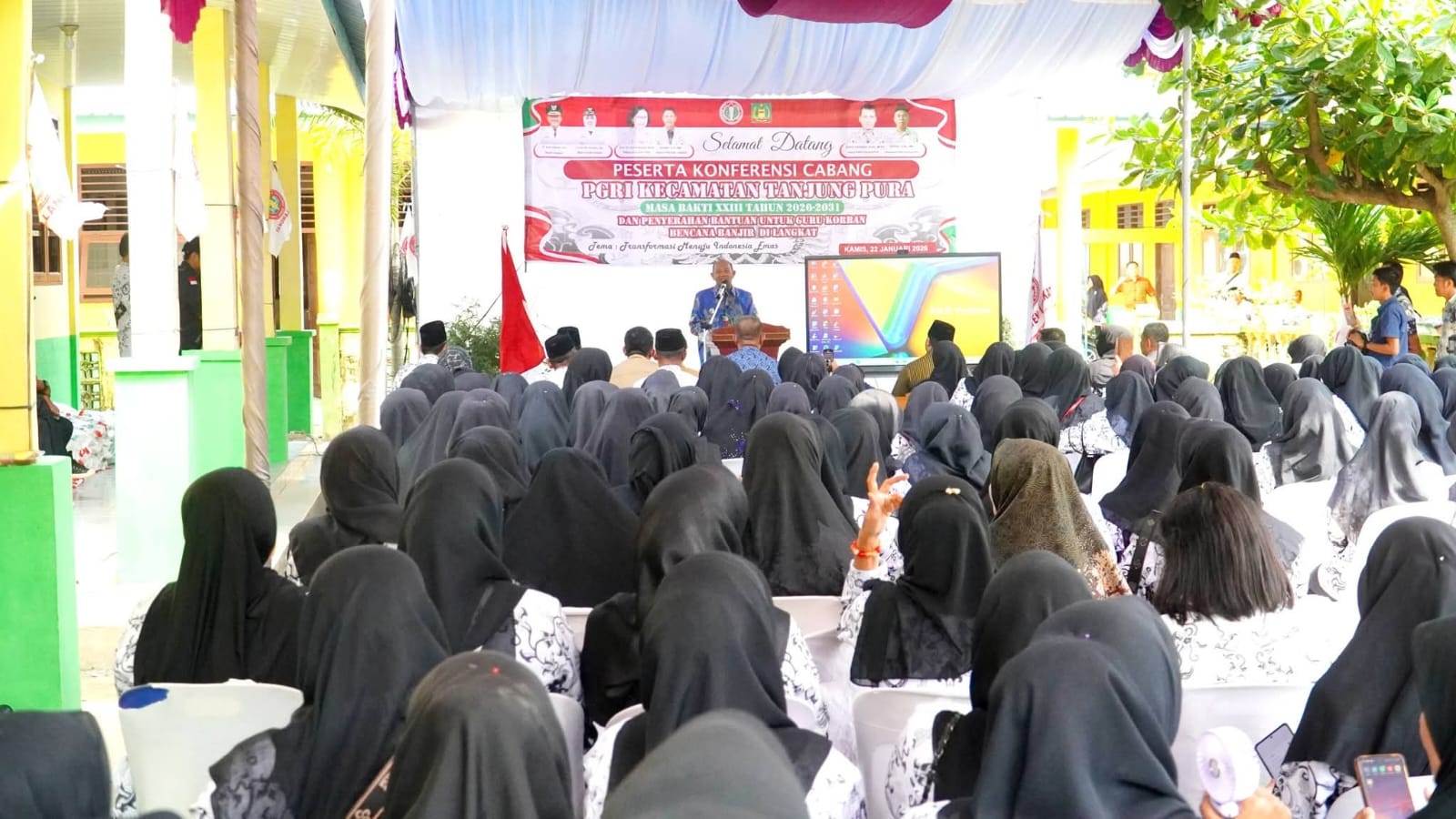 Sebelumnya, Ketua PGRI Kecamatan Tanjung Pura, Sukri Karnadi, dalam laporannya menyampaikan apresiasi dan terima kasih kepada Bupati Langkat atas kehadiran serta perhatian yang diberikan kepada para guru dan tenaga kependidikan yang terdampak banjir. Ia juga mengapresiasi kesediaan Bupati Langkat yang secara langsung menyalurkan bantuan sosial sekaligus membuka secara resmi Konferensi Cabang PGRI Kecamatan Tanjung Pura masa bakti XXIII Tahun 2026–2031.