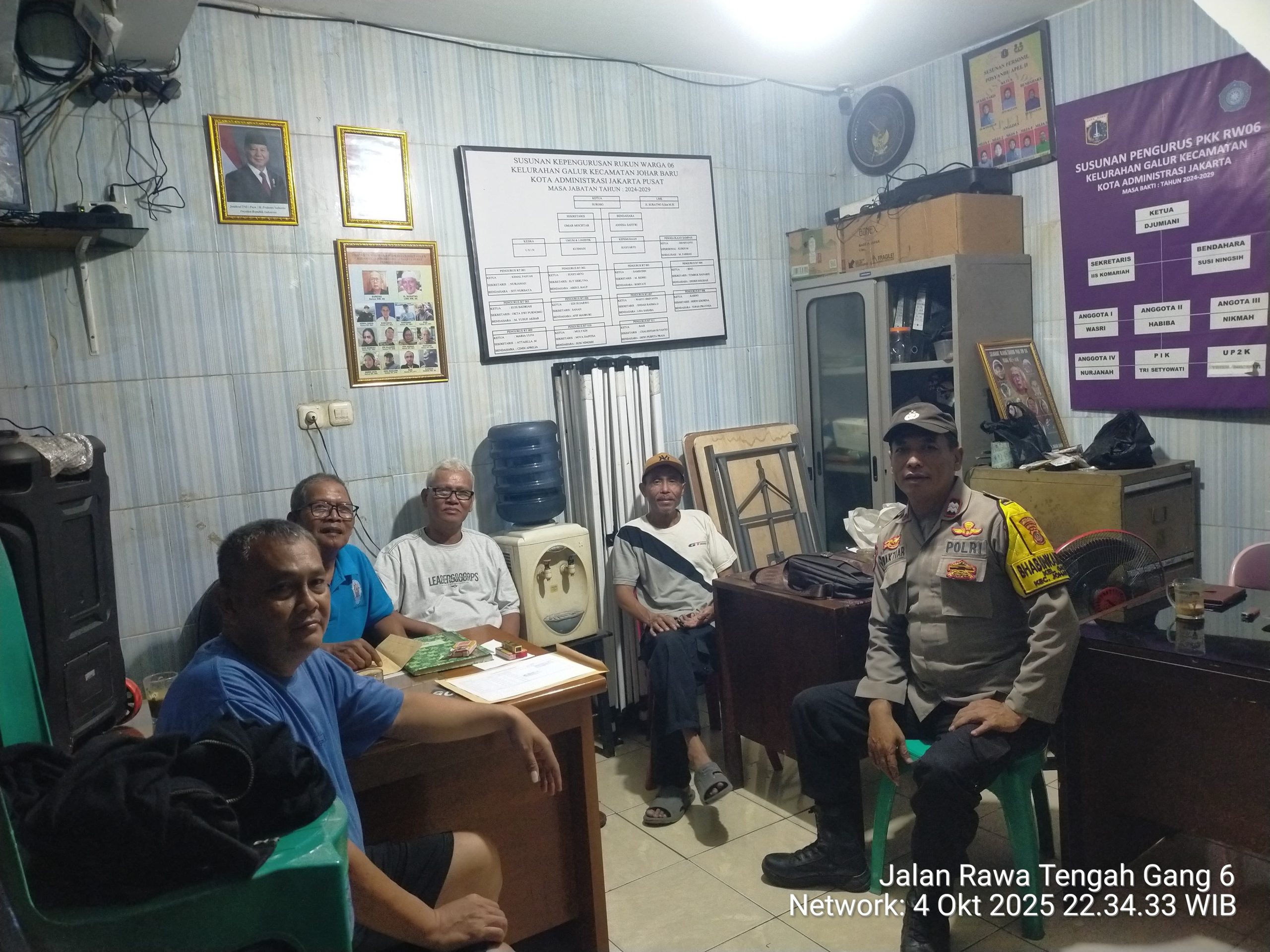 Jakarta Pusat – Dalam rangka menjaga situasi keamanan dan ketertiban masyarakat (Kamtibmas) tetap kondusif di wilayah Johar Baru, Bhabinkamtibmas Kelurahan Galur, Aiptu Baktiar, melaksanakan kegiatan sambang dan silaturahmi ke Pos Kamling RW 06, bertempat di Balai Warga RW 06, Jalan Rawa Tengah, Kelurahan Galur, Kecamatan Johar Baru, pada Sabtu malam (4/10/2025) pukul 22.30 WIB.