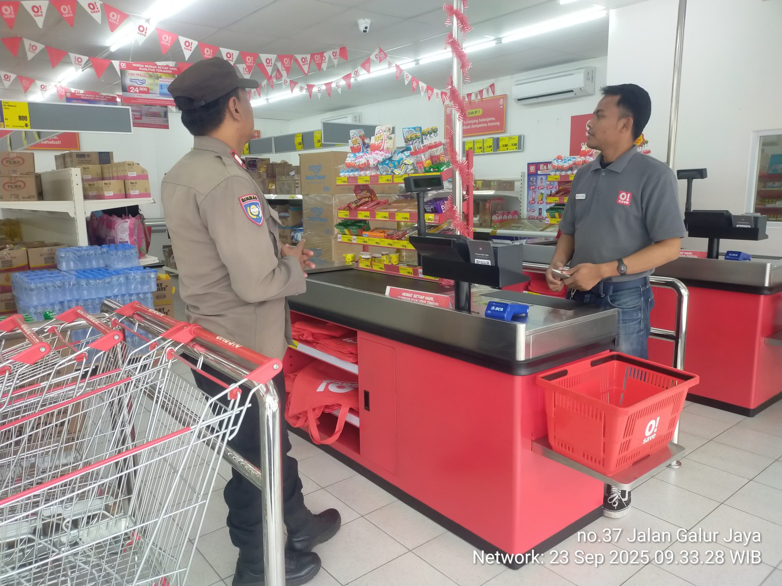 Dalam kegiatan tersebut, Bhabinkamtibmas bertemu dengan Pak Diki, karyawan Mini Market O! – Save, untuk memberikan himbauan kamtibmas sekaligus bertukar informasi terkait potensi kerawanan di wilayah sekitar.