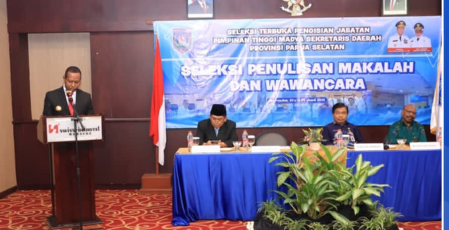 “Atas nama pemerintah, kami mengucapkan terima kasih kepada seluruh tim panitia seleksi terbuka jabatan pimpinan tinggi madya (JPT Madya) sebagai Sekretaris Daerah Provinsi Papua Selatan,” kata Gubernur Papua Selatan, Apolo Safanpo disela-sela sambutannya dalam pembukaan seleksi lanjutan penulisan makalah dan wawancara.