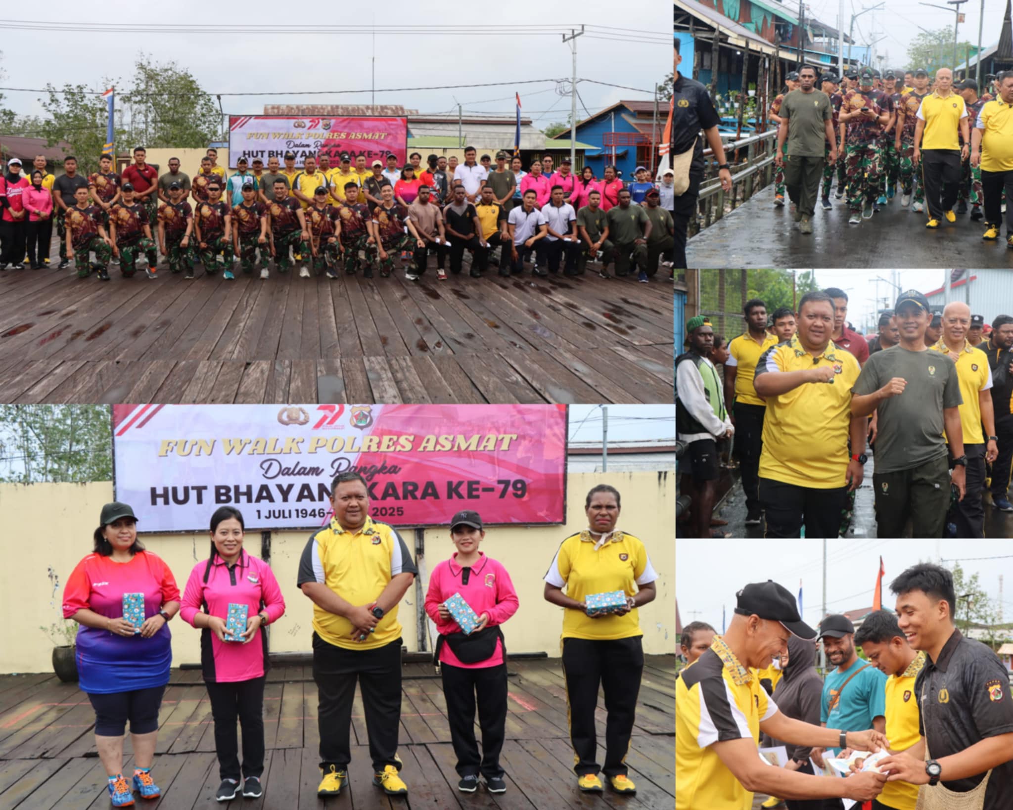 Dalam rangka memperingati Hari Bhayangkara Ke – 79 Tahun, Polres Asmat bersama TNI dan Seluruh Forkopimda Kabupaten Asmat Ikut Ramaikan Fun Walk atau Jalan Santai.