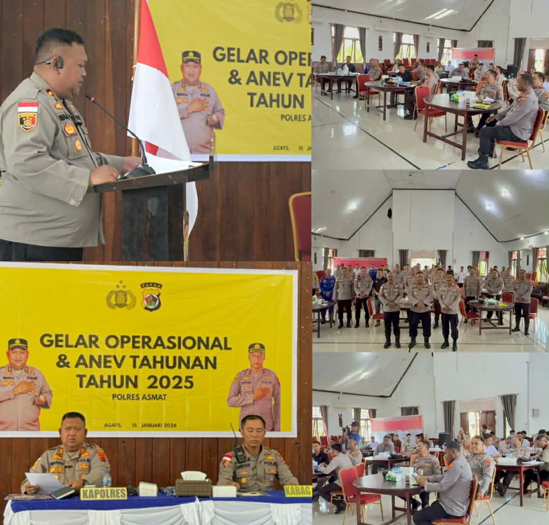 Asmat – Kapolres Asmat AKBP Wahyu Basuki, S.I.K., Pimpin Gelar Operasional dan Anev Tahunan Polres Asmat, Bertempat Di Aula Wira Pratama Polres Asmat, Kamis (15/01/2026).