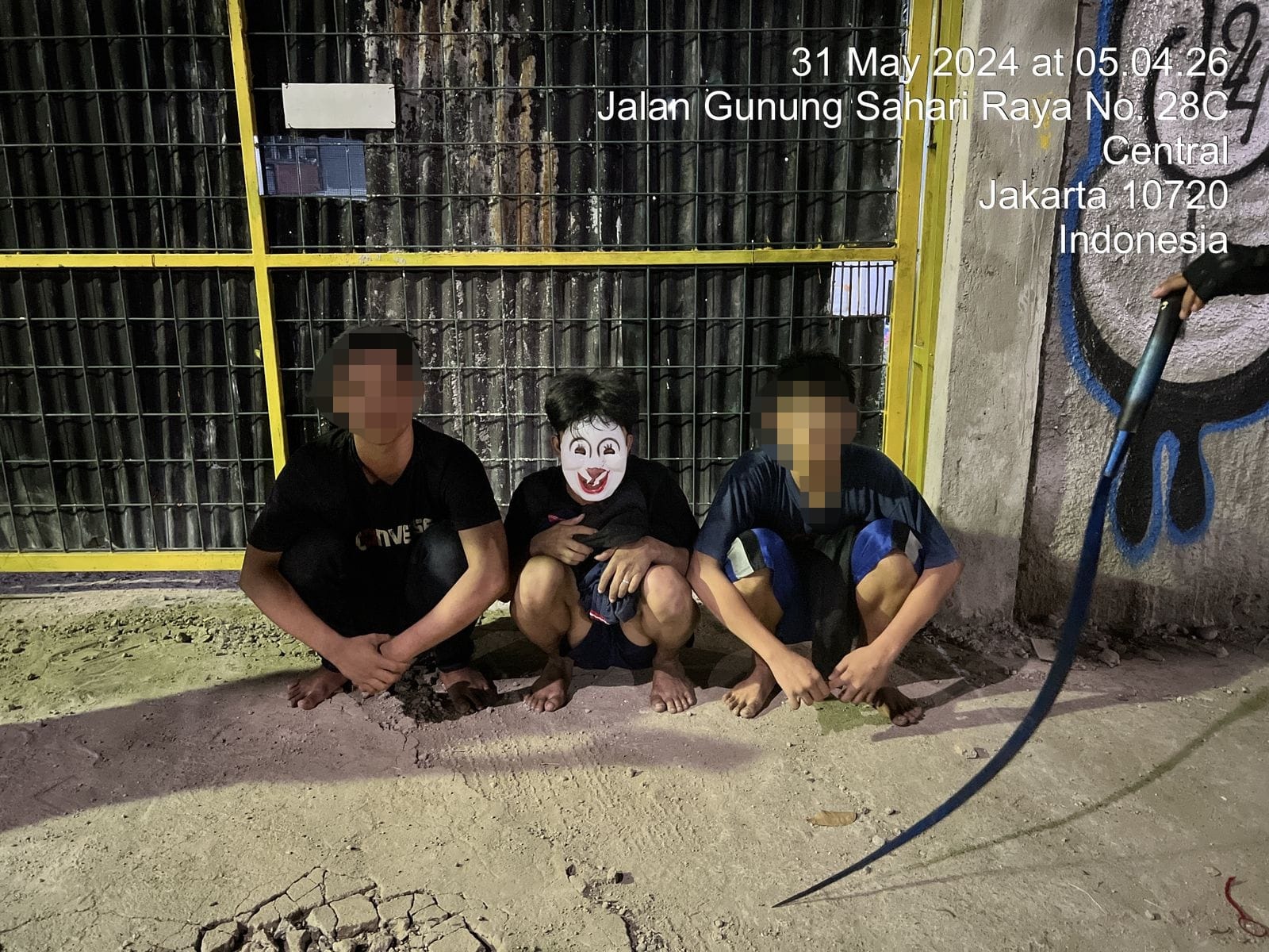 Saat tim sedang melaksanakan patroli rutin kewilayahan, melintas di wilayah Jl. Gunung Sahari Sawah Besar Jakarta Pusat melihat segerombolan anak-anak muda yang sedang nongkrong menunggu lawannya untuk tawuran, pada saat mau diamankan para pelaku sebagian melarikan diri, yang berhasil diamankan 3 (tiga) remaja dan di geledah ditemukan senjata tajam.
