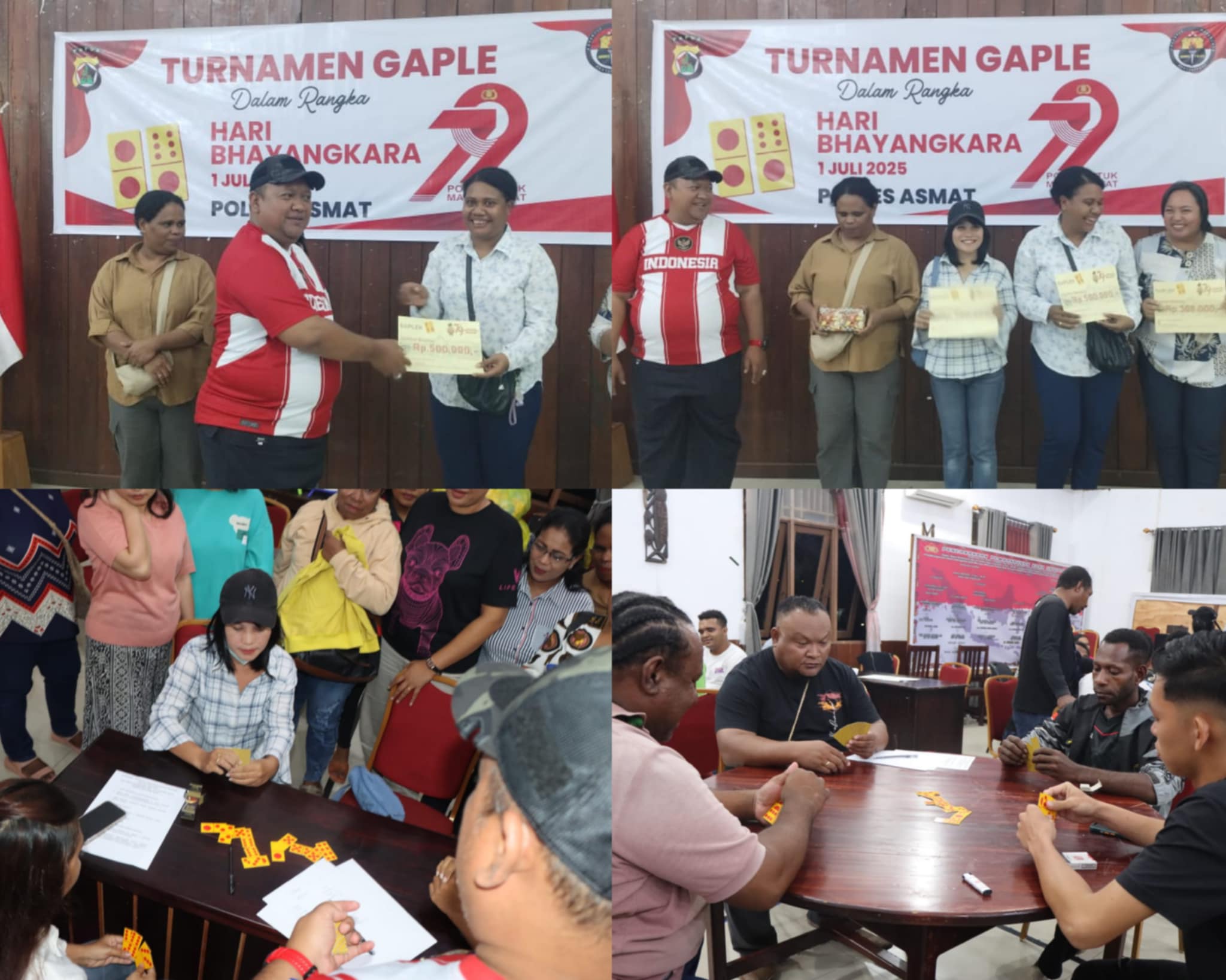 Turnamen Gaple ini dibuka langsung oleh Kapolres Asmat, AKBP Wahyu Basuki S.I.K,. Kegiatan ini diikuti oleh personel Polri, TNI, serta masyarakat umum sebagai bentuk hiburan dan mempererat silaturahmi antar institusi dan warga.
