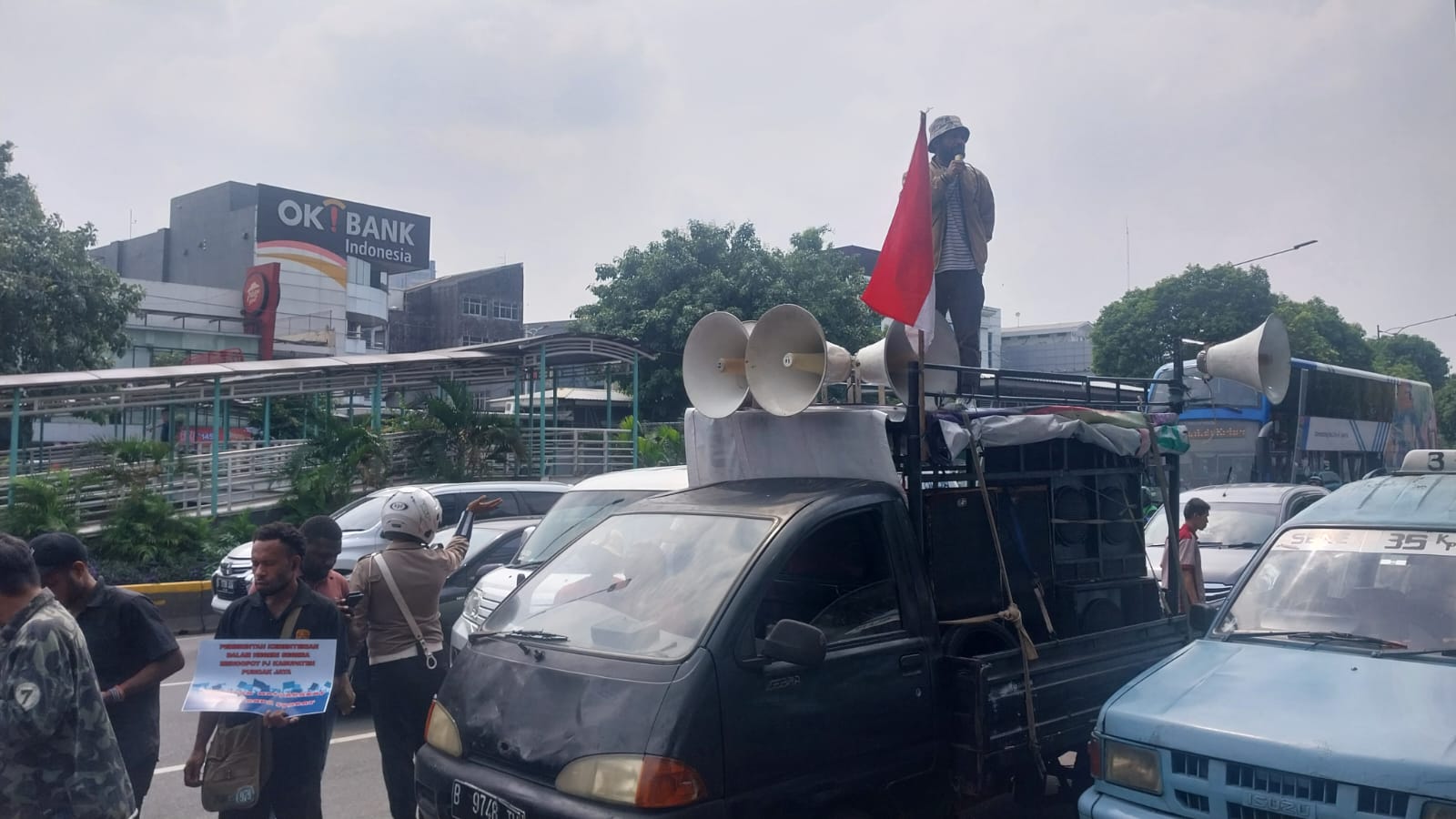 Ipda Norsyam bersama dengan sejumlah aparat gabungan melakukan pengaturan lalu lintas dan pengamanan aksi agar penyampaian pendapat tidak menggangu aktifitas pengendara lainnya.