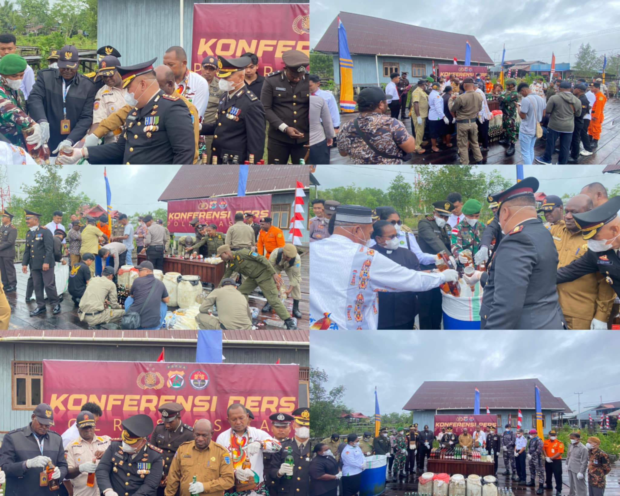 Asmat – Kapolres Asmat AKBP Wahyu Basuki, S.I.K., Bersama tamu undangan yang hadir Upacara Hari Bhayangkara Ke-79 Musnahkan Ratusan Miras, Bertempat Di Lapangan Apel Mako Polres Asmat, Selasa (01/07/2025).