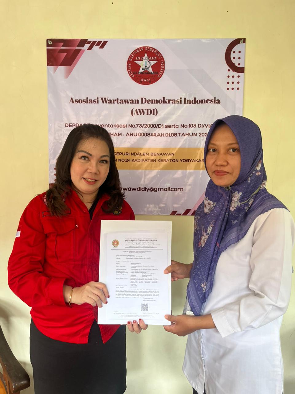 Yogyakarta, Suaraindonesia.online- Asosiasi wartawan demokrasi Indonesia (AWDI) Menerima penyerahan sertifikat dan di Terima oleh maria Veronica sebagai sekretaris wilayah DPW DIY yogyakarta
