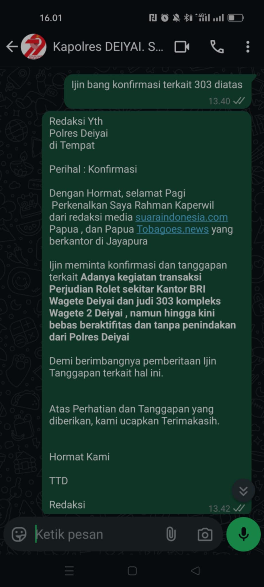 Ijin meminta konfirmasi dan tanggapan terkait *Adanya kegiatan transaksi Perjudian Rolex sekitar Kantor BRI Wagete Deiyai dan judi 303 kompleks Wagete 2 Deiyai , namun hingga kini bebas beraktifitas dan tanpa penindakan dari Polres Deiyai*