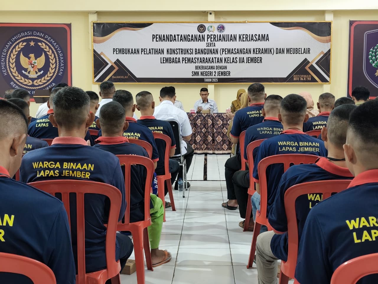 Jember, Suaraindonesia.online– Lembaga Pemasyarakatan (Lapas) Kelas IIA Jember menjalin sinergi dengan Sekolah Menengah Kejuruan Negeri (SMKN) 2 Jember melalui penandatanganan Perjanjian Kerja Sama (PKS). Kerja sama ini bertujuan untuk memberikan bekal keterampilan bagi Warga Binaan Pemasyarakatan (WBP) Lapas Jember. Acara tersebut sekaligus menandai dimulainya kegiatan pelatihan konstruksi bangunan dan meubelair, pada Selasa (12/08/2025).