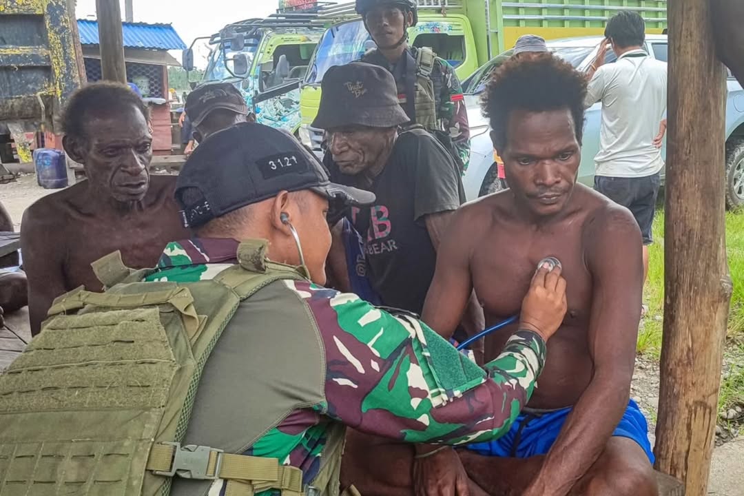 Satgas Pamtas Mobile RI-PNG Yonif 503/Mayangkara berikan pelayanan kesehatan bagi masyarakat di pelabuhan Amor, Distrik Krepkuri, Kabupaten Nduga Papua. Selasa (14/01/2025).