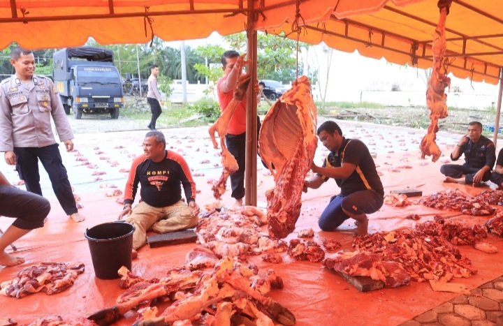 Kegiatan penyembelihan dan pembagian daging bertempat di halaman mako polres Subulussalam.