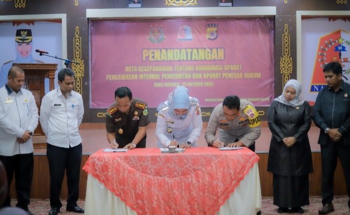 Nagan Raya, Aceh | Suaraindonesia.online – Pemkab Nagan Raya melakukan penandatanganan Nota Kesepahaman tentang Koordinasi Aparat Pengawasan Internal Pemerintah (APIP) dan Aparat Penegak hukum (APH) dalam Penanganan Laporan atau Pengaduan Penyelenggaraan Pemerintah Daerah, Penandatanganan yang dilakukan oleh Penjabat (Pj) Bupati Nagan Raya, Fitriany Farhas AP, S.Sos., M.Si bersama Kapolres Nagan Raya, Rudi Saeful Hadi, SIK dan Kajari Nagan Raya, Muib, SH., MH berlangsung di Pendopo Bupati, Nagan Raya,hal ini dilansir dari keterangan siara pers yang diterbitkan Diskominfotik Naga Raya Rabu (25/10/2023).