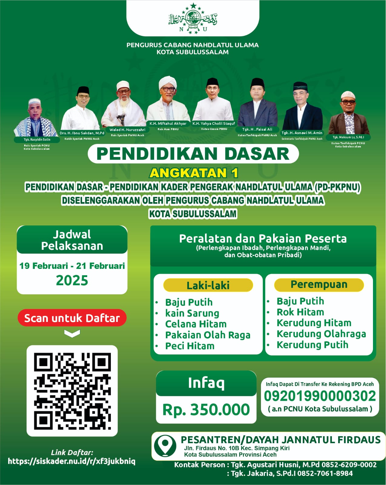 “Pendidikan Dasar Pendidikan Kader Penggerak NU angkatan 1 ini bakal dilaksanakan di Pondok Pesantren/Dayah Jannatul Firdaus, berlangsung pada tanggal 19 s/d 21 Februari 2025″, ujar Tgk. Agustari.
