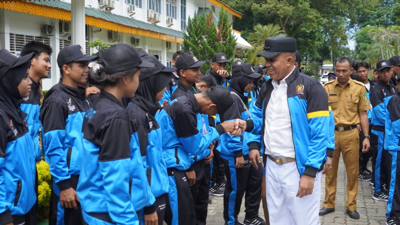 Langkat,- Pj Bupati Langkat H.M.Faisal Hasrimy AP,M.AP di dampingi oleh Kadispora Ngaturken PA,M.Pd melepas 76 atlet kontingen Kabupaten Langkat untuk mengikuti Pekan Olahraga Pelajar Provinsi Sumatera Utara (POPPROVSU), di halaman Kantor Bupati Langkat, Senin siang (1/7/2024).