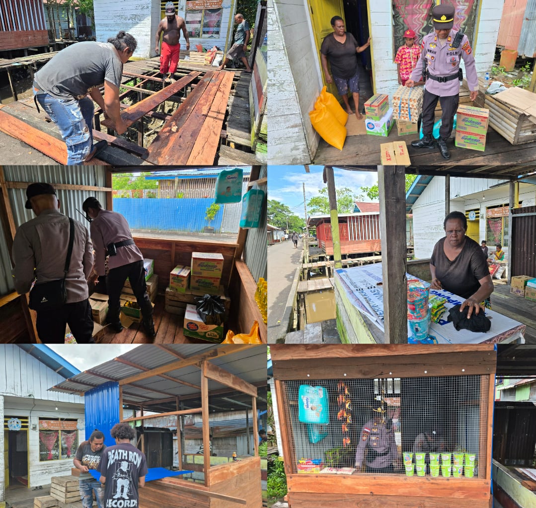 Asmat – Kapolres Asmat AKBP Wahyu Basuki, S.I.K., melalui Kasat Samapta Iptu Irwan, Rehab Tempat Usaha sekaligus Berikan Bantuan Pengembangan Usaha Kios Kepada Masyarakat Kampung Bis Agats, Rabu (30/10/2025).