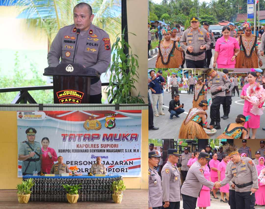 Kapolres Supiori Kompol Ferdinand B. Maasawet, S.I.K., M.H dalam sambutannya mengatakan, rasa syukur dan haru atas sambutan hangat yang diberikan.