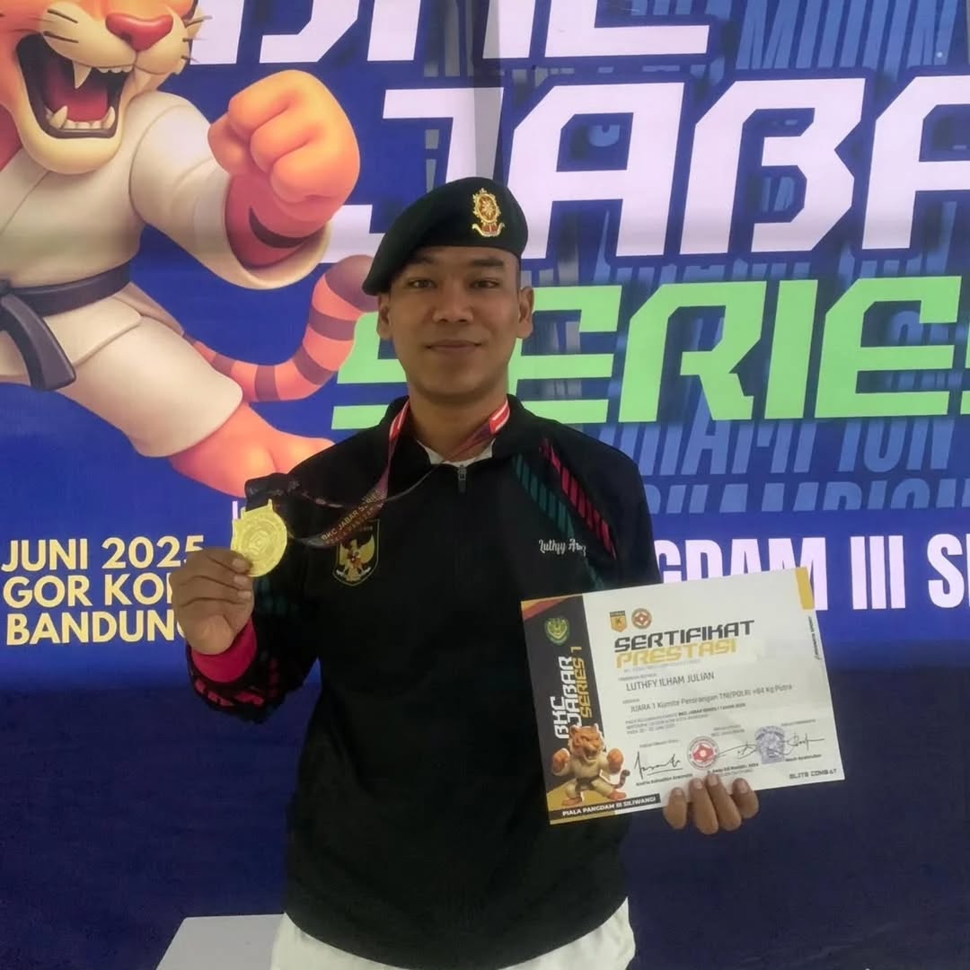 Bandung – Prestasi membanggakan kembali ditorehkan oleh prajurit Yonarmed 13 Kostrad. Pratu Luthfy Ilham Julian (NRP 1721107990001649) berhasil meraih Juara 1 Kelas Senior Kumite TNI/Polri +84 KG Putra dalam ajang Kejuaraan Piala Pangdam III/Siliwangi BKC Jabar Series 2025 yang diselenggarakan di GOR KONI, Kota Bandung, pada tanggal 20–22 Juni 2025.