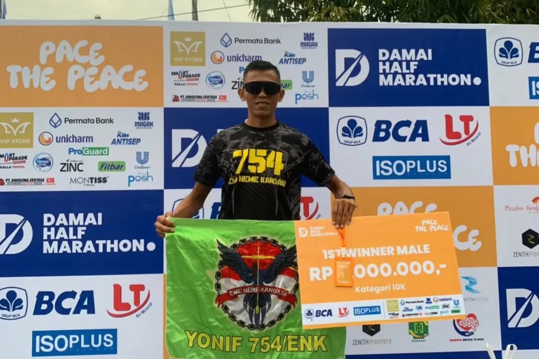 Dalam kategori Damai Run 10K, Pratu Irsan sukses mengalahkan 2.430 peserta lainnya dan berhasil naik podium sebagai juara pertama dengan catatan waktu 32 menit 36 detik. Prestasi ini tidak hanya menjadi bukti kemampuan fisik dan mentalnya yang tangguh, namun juga wujud nyata dari tekad seorang prajurit Kangasi dalam memberikan yang terbaik, di manapun berada.