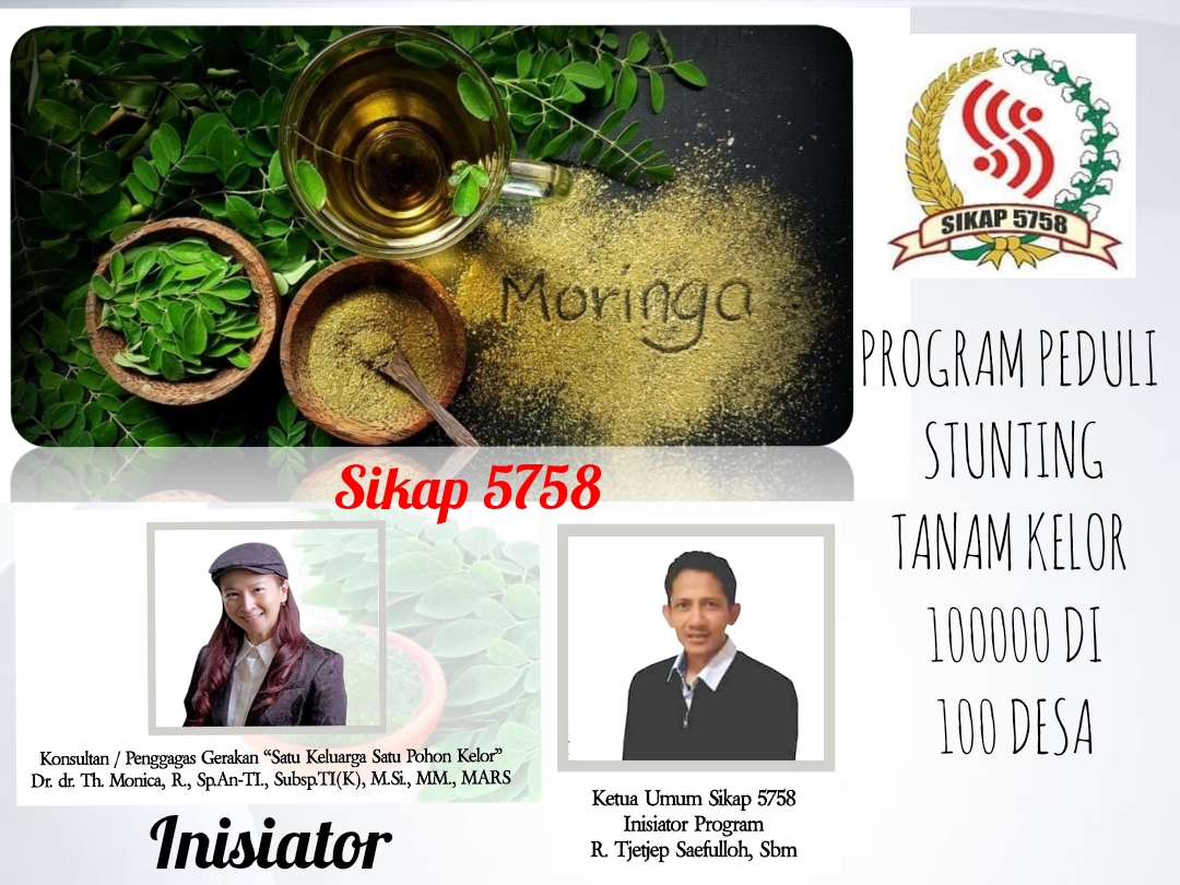 Program ini berawal dari Gagasan Dr. dr. Monica yang akhirnya oleh Sekertaris Jendral SIKAP 5758, Mohammad Agam Hafidiyanto,SH mencetuskan konsep Program 100.000 Tanam Pohon Kelor “Anti Stunting of Moringa Leaves For Indonesian Children in The Future, bersama Ketua Umum Sikap 5758, R. Tjetjep yang memiliki misi organisasi yaitu KETAHANAN PANGAN & KESEHATAN BANGSA, program kegiatan ini juga merupakan hasil kolaborasi dengan Praktisi Medis & Penggagas Gerakan “Satu Keluarga Satu Pohon Kelor”, Dr. dr. Th. Monica, R., Sp.An-TI., Subsp.TI(K), M.Si., MM., MARS., yang juga merupakan Inisiator Terapi Plasma Konvalesen saat Pandemi COVID-19. bekerja sama dengan Dr dr. penggagas 1 rumah 1 kelor.