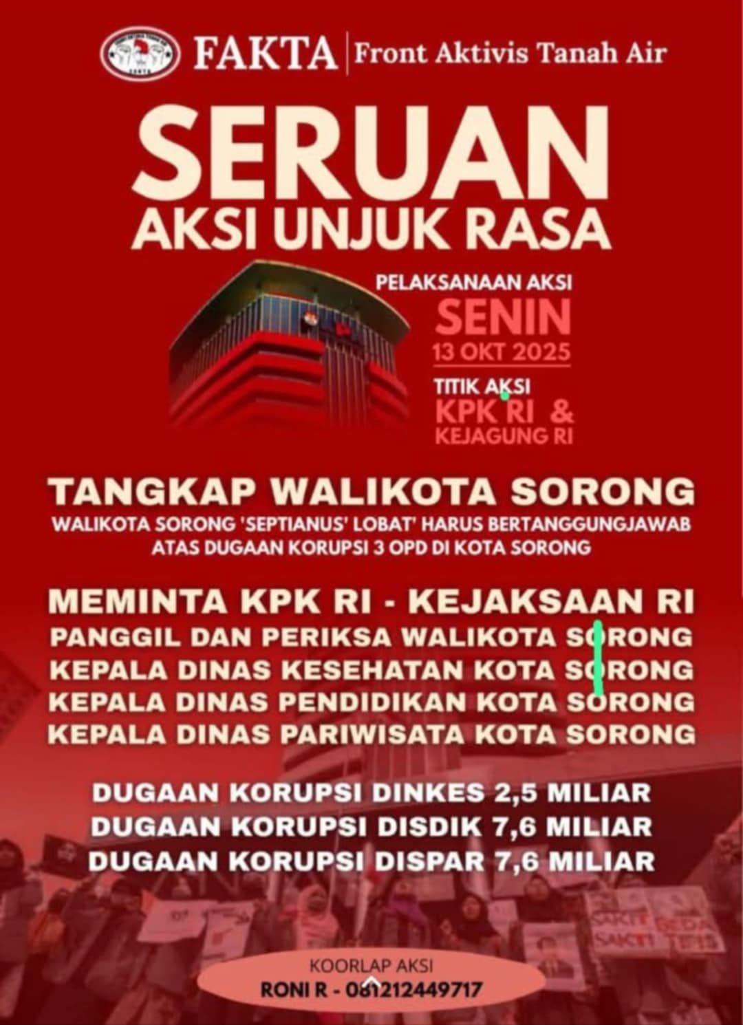 Jakarta, – Sebuah poster seruan aksi unjuk rasa yang mengatasnamakan Front Aktivis Tanah Air (FAKTA) beredar luas di media sosial. Poster tersebut berisi seruan untuk melakukan aksi pada Senin, 13 Oktober 2025, di dua titik utama, yakni Gedung Komisi Pemberantasan Korupsi (KPK RI) dan Kejaksaan Agung RI.