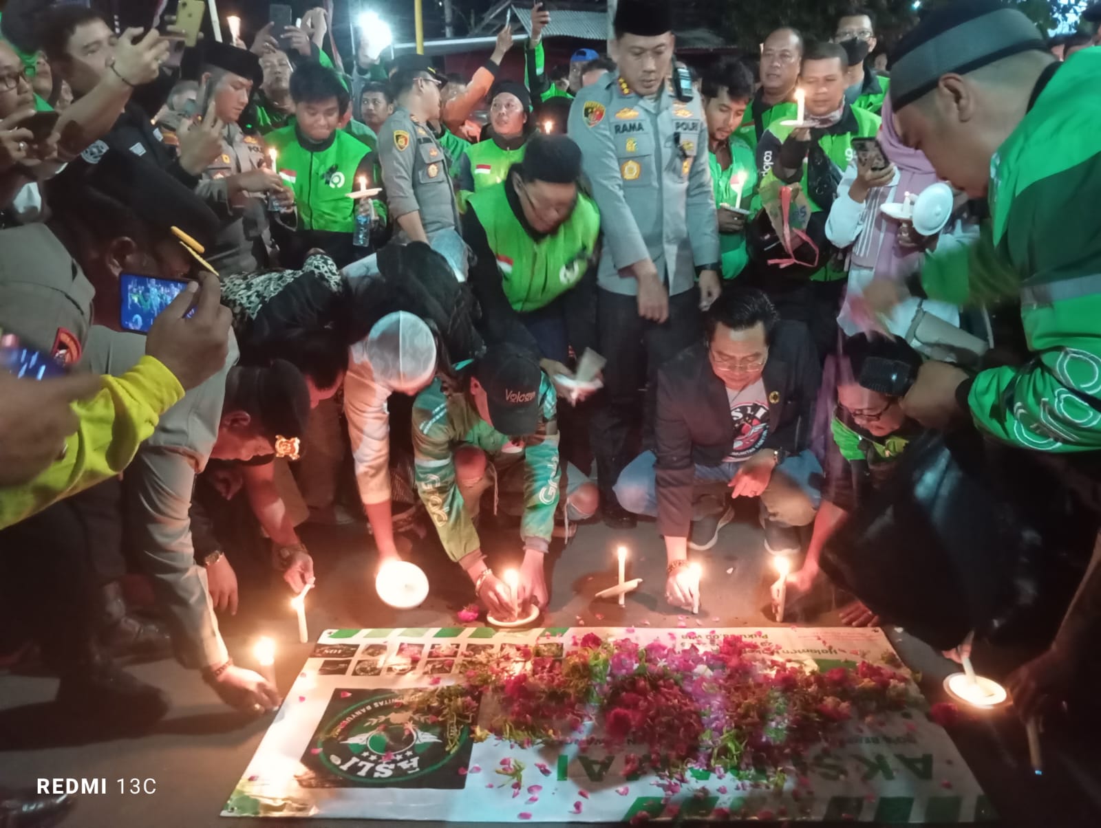 Setelah itu, pengemudi ojol melakukan doa bersama untuk Almarhum Afan yang menjadi korban kecelakaan mobil rantis Brimob dan di lanjutkan mengutarakan tuntutanya di depan Kapolresta dan tabur bunga juga penyalaan lilin.