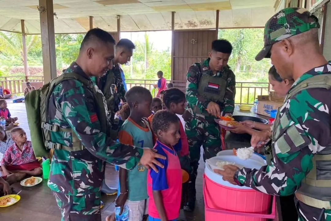 Jakarta. Satgas Pamtas Mobile Yonif 503 Kostrad merayakan hari pendidikan nasional (Hardiknas) dengan cara makan bareng Anak – anak di Sekolah Rimba, Kecamatan Batas Batu, Kabupaten Nduga Papua. Jumat(03/05/2024).