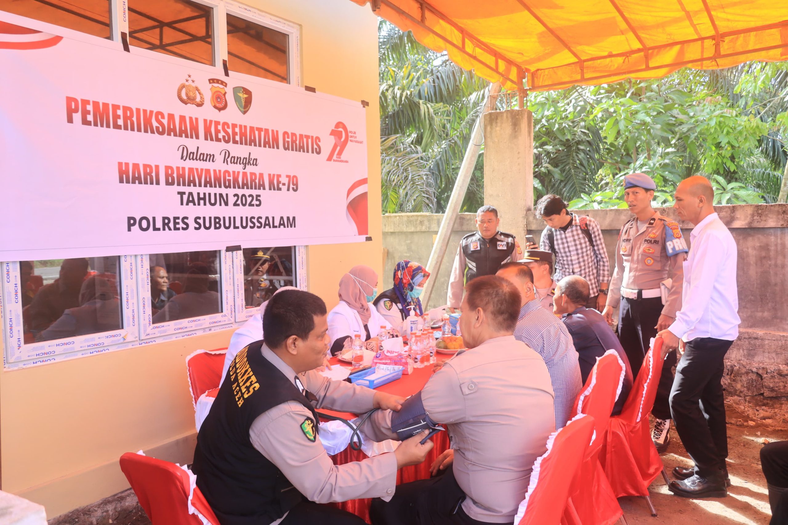 Aceh, SuaraindonesiaOnline- Dalam rangka menyambut hari Bhayangkara ke-79, Kepolisian Resor Subulussalam melalui Seksi Kedokteran dan Kesehatan (Sidokkes) menggelar pemeriksaan kesehatan gratis bagi masyarakat, bertempat di Poliklinik Polres Subulussalam, Rabu, 18 Juni 2025.