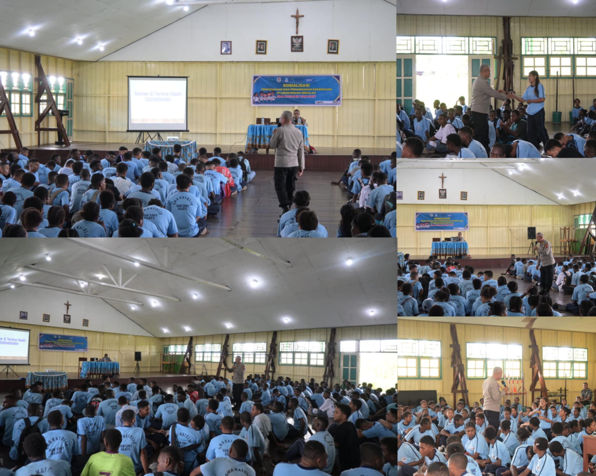 Asmat – Kasat Binmas Polres Asmat AKP Muhammad Ja’far, S.Sos., Bersama Banit Binpolmas Sat Binmas Brigpol Abaz Laika, Sosialisasikan Pencegahan dan Penanganan Kekerasan di Sekolah, Bertempat Di Aula SMA Katolik Yang Smith Agats, Rabu (23/07/2025).