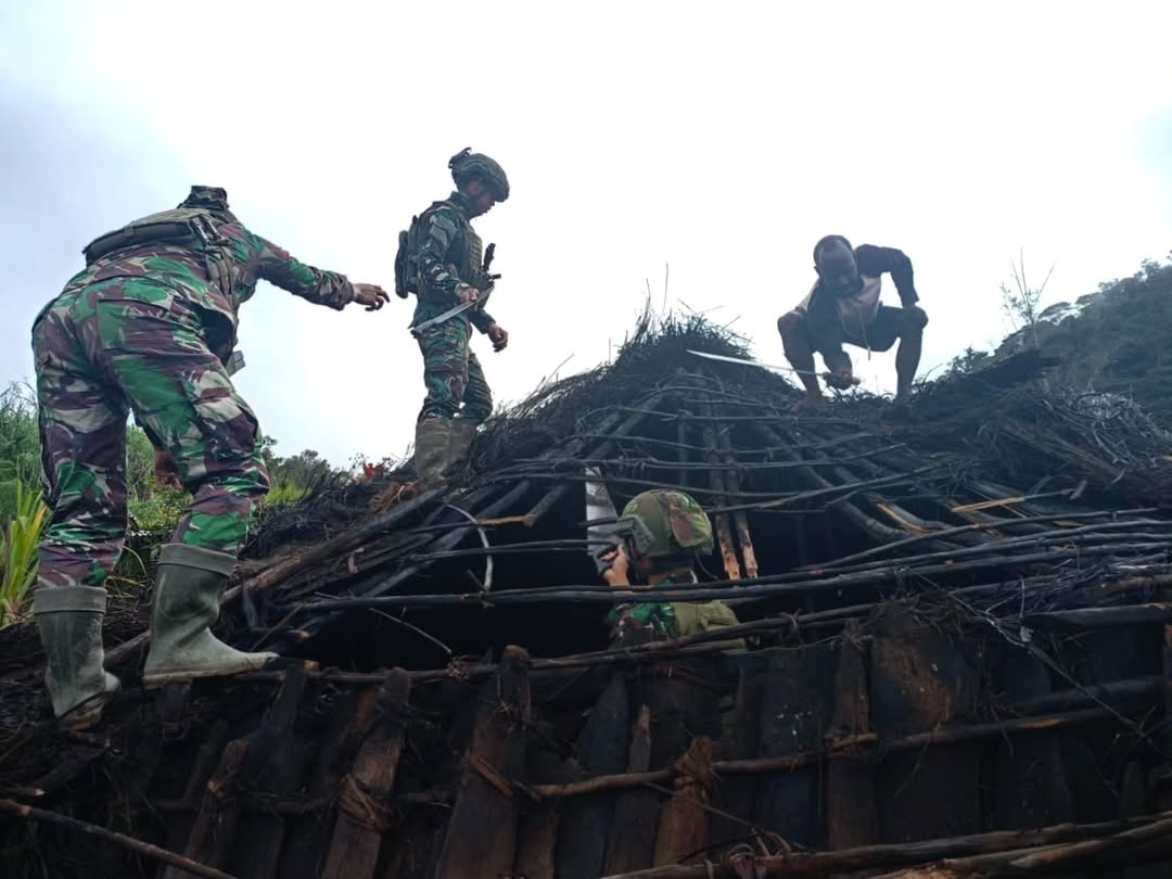 Dengan gerakan sigap, prajurit dari Titik Kuat Pintu Jawa membantu memperbaiki honai milik bapak Maringge Tabuni yang rusak tersebut. Dimulai dari pembongkaran atap honai dilanjutkan dengan penggantian rangka atap honai yang rusak dengan kayu yang baru.