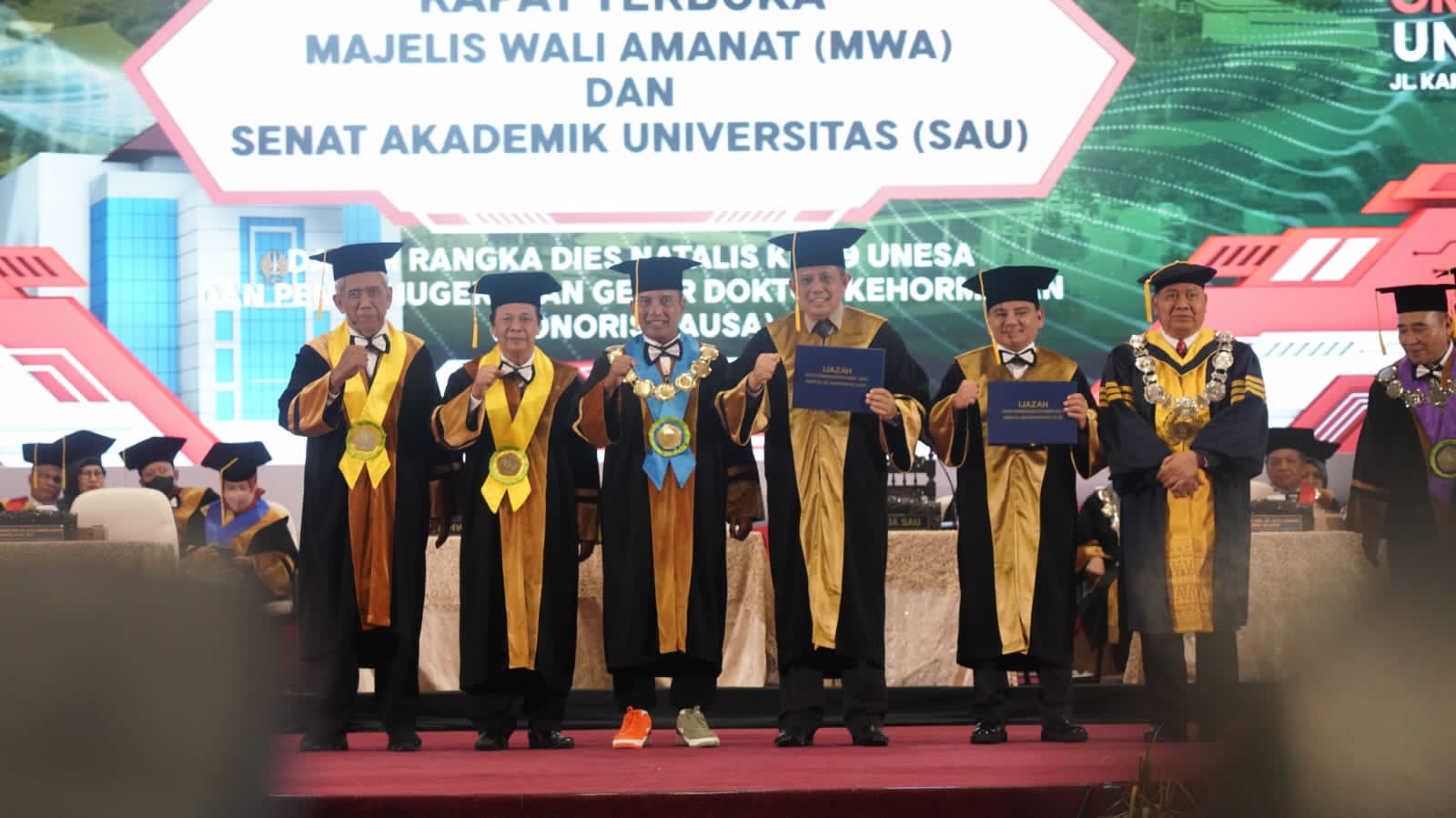 Wisuda penganugerahan Doktor Honoris Causa Unesa dihadiri oleh Menteri Hukum dan HAM yang sekaligus memberikan sambutan. Turut hadir pula Wakil Menteri Hukum dan HAM, para Pimpinan Tinggi, Pejabat Utama serta perwakilan pegawai Kemenkumham dan anggota dari jajaran Polri.