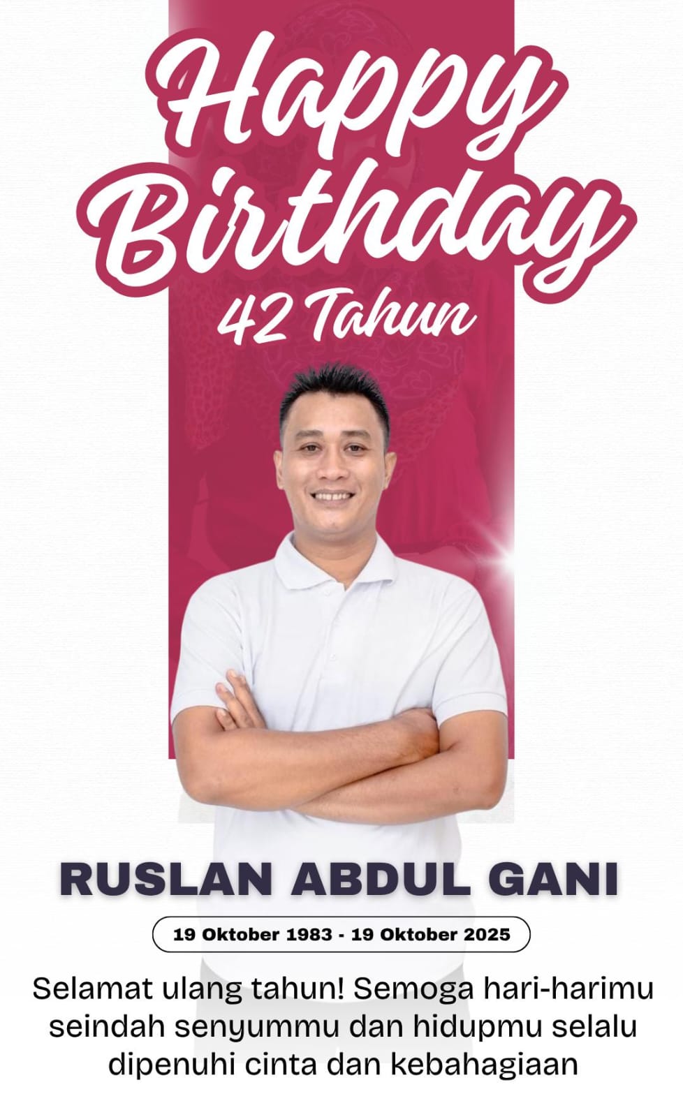 “Selamat ulang tahun ke-42 untuk Saudara Ruslan Abdul Gani. Semoga senantiasa diberikan kesehatan, keberkahan, dan kesuksesan dalam setiap langkah pengabdian,” ujar Zaibi.