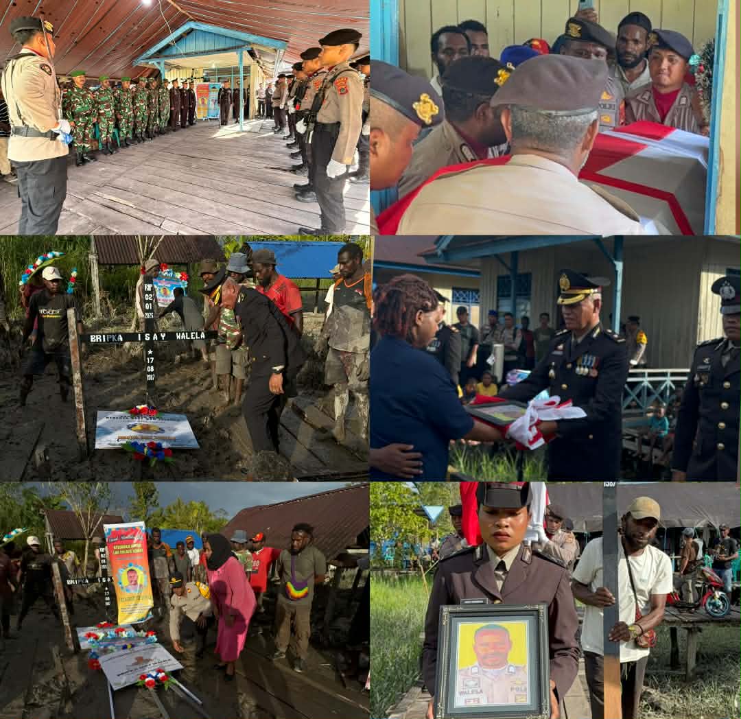 Kapolres Asmat AKBP Wahyu Basuki, S.I.K., melalui Wakapolres Asmat Kompol Haryono, S.H., Bertindak selaku inspektur upacara dalam penghormatan terakhir bagi almarhum Bripka Isay Walela yang telah mengabdikan diri dengan penuh dedikasi sebagai anggota Polri.