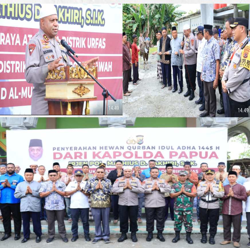 WAROPEN – Dalam rangka menyambut Idul Adha 1445 Hijriah, Kapolda Papua Irjen Pol. Mathius D. Fakhiri, S.I.K., bersama Wakapolda Papua Brigjen Pol. Patrige Rudolf Renwarin, S.H., M.Si., menyerahkan hewan qurban kepada tiga Masjid di Waropen, Rabu (12/6).